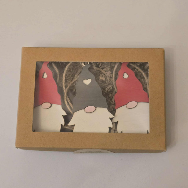 Tämä setti on tehty suomalaisesta koivuvanerista ja käsin maalattu. Tontut roikkuvat juuttinarussa. Setissä kolme erilaista tonttua. Tontun korkeus noin 9cm