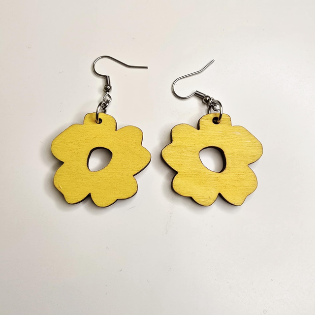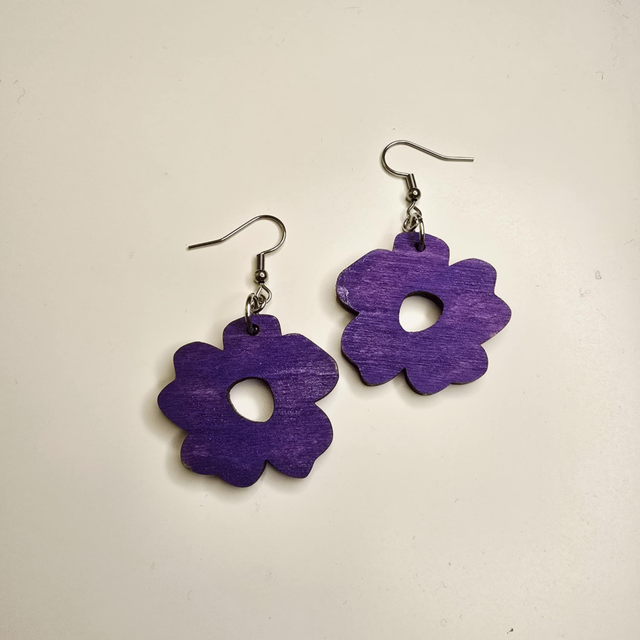 retroaiheiset kukkakorvakorut, koruosa kirurginterästä, suomalaista koivuvaneria